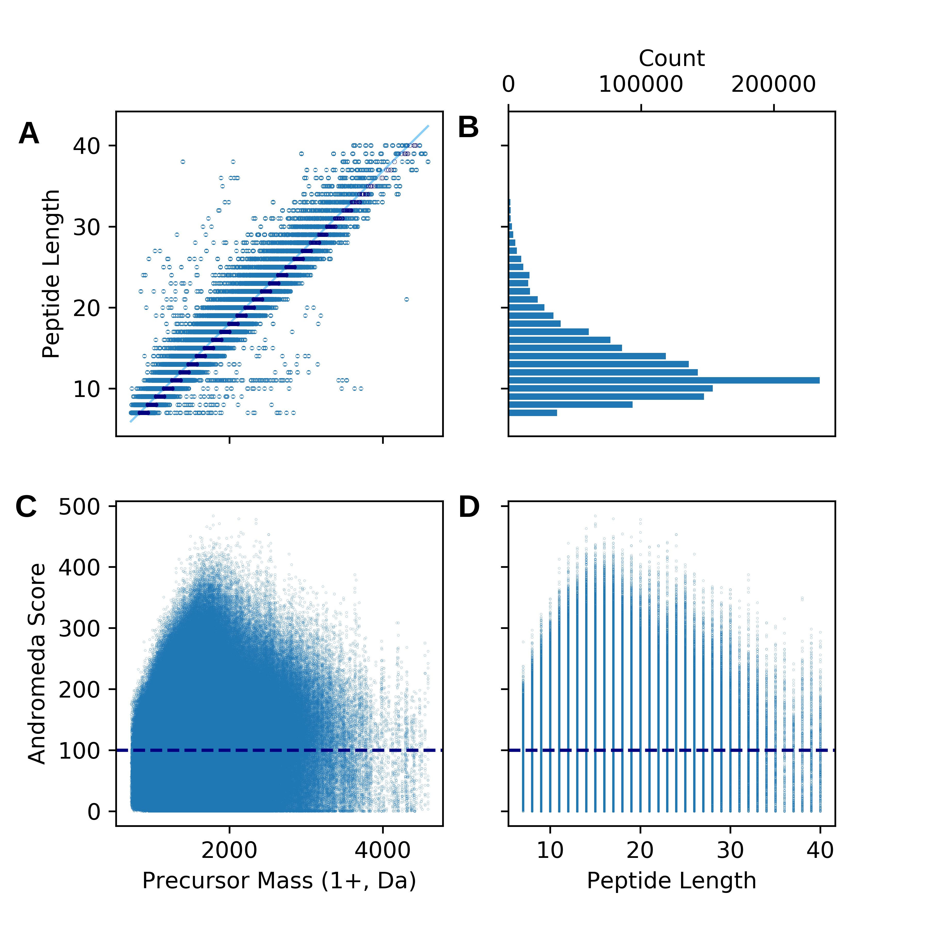Figure 3 - Some statistics of the ProteomeTools data. A: Precursor mass vs peptide length. B: Distribution of peptide lengths. C: Precursor mass vs Andromeda (MaxQuant's peptide search engine)'s score for the peptide-spectrum match (PSM). D: Peptide length vs Andromeda score.
